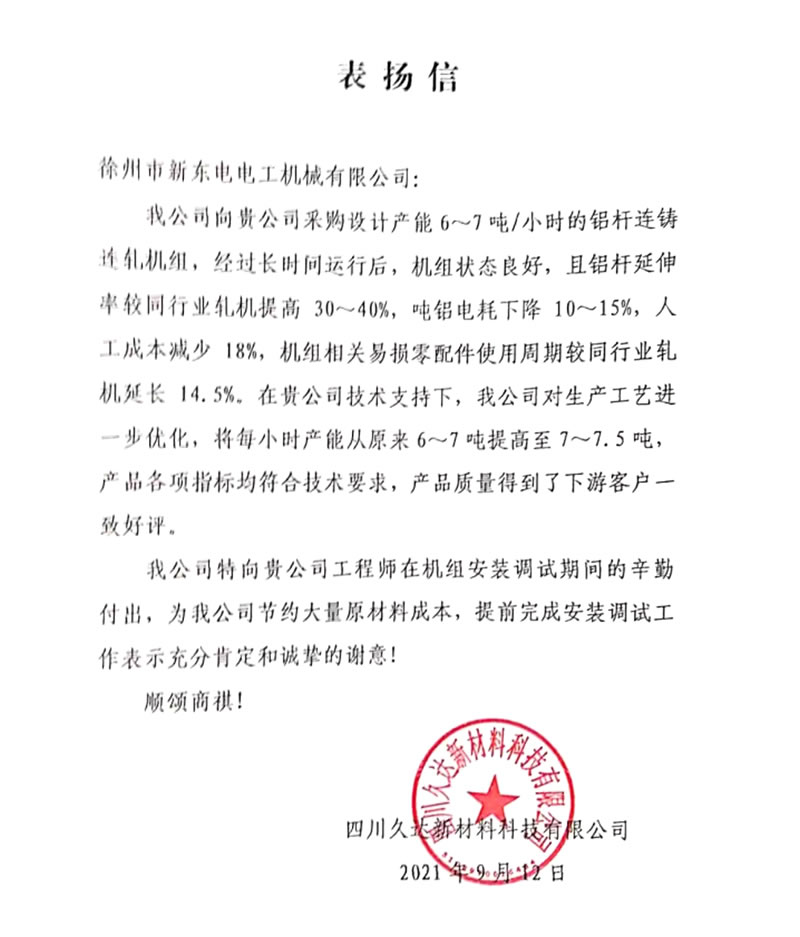 我公司向貴公司采購設計產能6~7噸/小時的鋁桿連鑄連軋機組,經過長時間運行后,機組狀態良好,且鋁桿延伸率較同行業軋機提高30~40%,噸鋁電耗下降10~15%,人工成本減少l8%,機組相關易損零配件使用周期較同行業軋機延長14.5%。在貴公司技術支持下,我公司對生產工藝進一步優化,將每小時產能從原來6~7噸提高至7~7.5噸,產品各項指標均符合技術要求,產品質量得到了下游客戶一致好評。